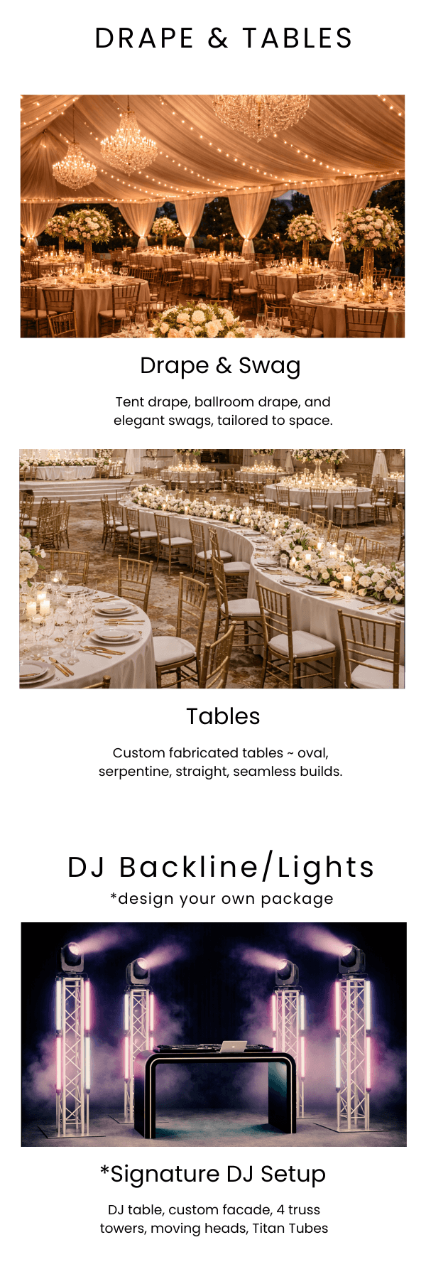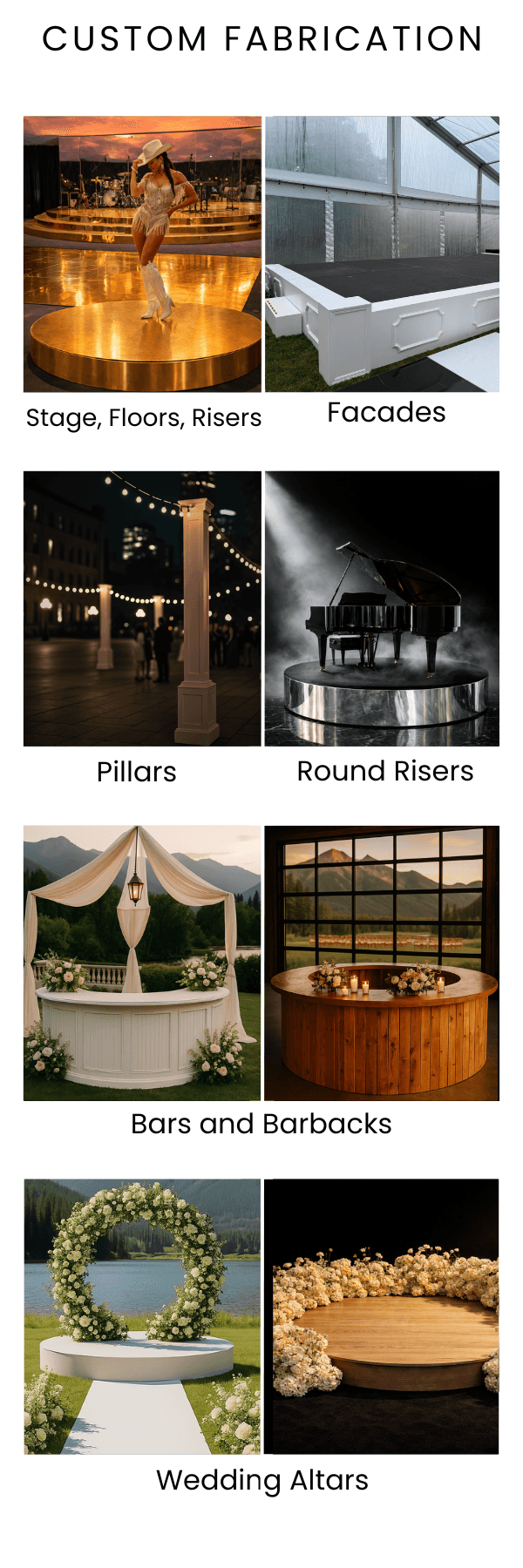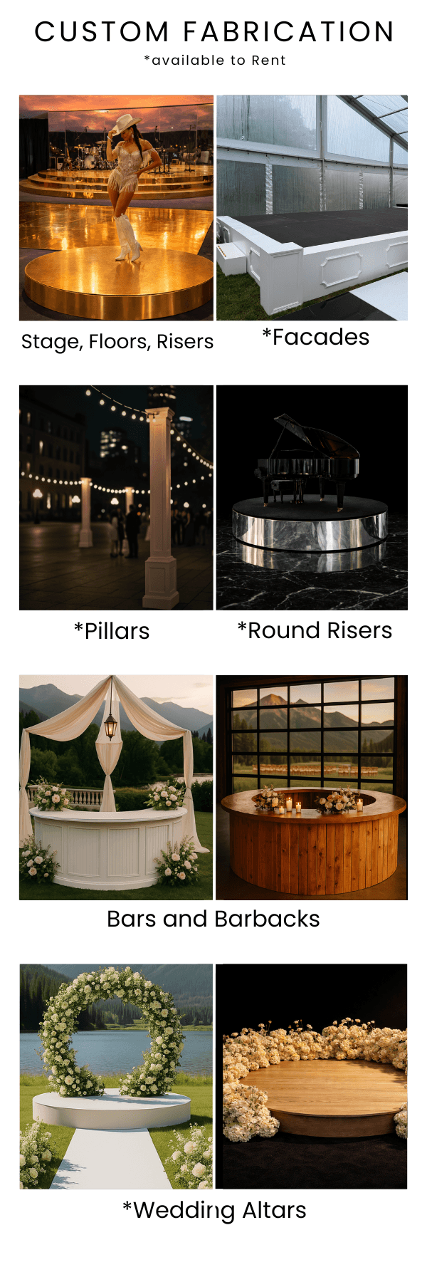 Environmental elevations are elements that refine a space. Facades, custom builds, scenic pieces, bars, custom altars & aisles, DJ gear and more… are integrated to enhance function, focus, and overall presence.